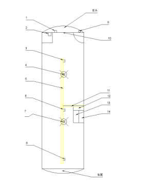 (1-PLC處理器和蓄電池;2-按鈕盒;3-前噴頭;4-第一紅外探測器;5-共軌管道;6-中噴頭;7-第二紅外探測器;8-后噴頭;9-報警器;10-太陽能面板;11-雙橡膠軟管;12-第一電磁閥和第二電磁閥室;13-NaHCO3溶液罐;14- AL2(SO4)3溶液罐)