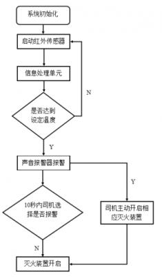 作為公交與汽運的主要用車,其運行安全方面問題也備受關注,一系列如臺灣客車自然,日本停車場汽車自燃等的事故所造成的巨大損失嚴重威脅著乘客們的生命財產安全。在夏季太陽的炙烤下,暴曬的車輛車內溫度能夠達到60攝氏度以上,車內的易燃易爆物品會變得非常危險,很容易成為自燃的禍首。現在很多的汽車內飾材料,一般不具備防火性能,一旦發生火災,火勢容易蔓延。若處置不及時則后果不堪設想。準對上述問題,本文設計一種大巴車室內自燃警報及自動滅火系統,實時監控大巴車室內的溫度變化,如果發現火情及時自動處理。