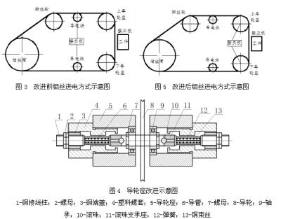 3)進(jìn)電方式的改進(jìn)。DK7732型快走絲線切割機采用鉬絲在導(dǎo)電塊表面無束滑行的方式進(jìn)電(如圖3所示),當(dāng)鉬絲在高速運行中發(fā)生抖動時會使鉬絲與導(dǎo)電塊之間接觸不穩(wěn)定,造成進(jìn)電不穩(wěn);鉬絲與導(dǎo)電塊處產(chǎn)生二次火花放電,降低施加在鉬絲與工件間的脈沖能量,從而減緩切割速度;火花放電會在導(dǎo)電塊表面切割出細(xì)槽,此細(xì)槽會卡信鉬絲,增加鉬絲的運行阻力,造成鉬絲被拉斷及工件報廢。如果將負(fù)極前移至與導(dǎo)輪座相連,改導(dǎo)電塊進(jìn)電為導(dǎo)輪座進(jìn)電,導(dǎo)電塊只起支承作用,改進(jìn)后的導(dǎo)輪座如圖4所示。圖中滾珠10通過彈簧的作用與導(dǎo)輪軸緊接觸,這樣脈沖電流從接線柱1、銅束絲13、滾珠10將電流傳遞給導(dǎo)輪,鉬絲在導(dǎo)輪上進(jìn)電,改進(jìn)后,不但縮短了進(jìn)電路線,也增大了鉬絲的接觸長度,使進(jìn)電可靠,改進(jìn)后的進(jìn)電方式如圖5所示。