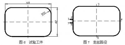 在改造過的DK7732型快走絲線切割機上,使用多次切割技術(shù)切割如圖6所示的凸模工件。切割分三次完成,走絲路線如圖7所示。第一次粗切割沿著1→2→3→4→5→6→7路徑,第二次粗切割沿著7→6→5→4→3→2→1路徑進(jìn)行,第三次精微切割沿著1→2→3→4→5→6→7路徑。