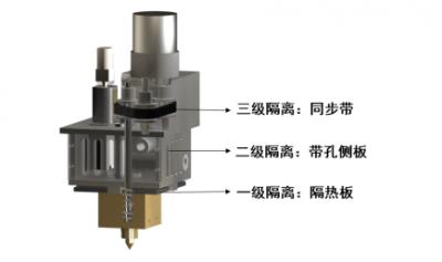 因而在本文中,我們主要設計的是如何做這種新型打印機的隔熱系統。首先介紹該新型打印機噴頭的機械結構,而后對該隔熱系統進行理論計算和仿真分析,最后是實物測試。