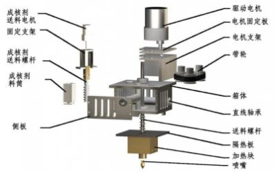 由于所用的PET材料是扁平狀,且需對材料進行改性處理。不能使用現有的打印噴頭進行打印,由此我們設計了一種新型噴頭隔熱系統,打印噴頭結構主要包括螺旋送料的成核劑添加控制機構、正反螺紋螺桿擠出機構、加熱及隔熱系統。