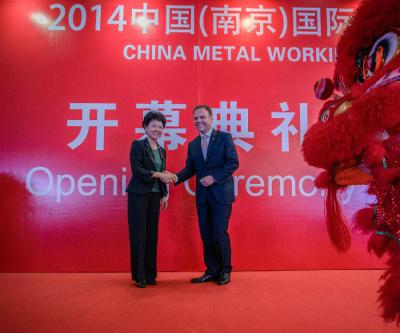 江蘇省發展改革委副主任兼省外發展協會會長--鄭曉榮女士、德國巴符州財政與經濟部 國務秘書--英格脠斯特先生及德國斯圖加特展覽公司董事總經理--普蘭浩先生等一行蒞臨了2014年中國(南京)國際金屬加工展覽會的開幕式典禮(即AMB China展)。圖1