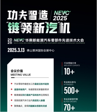 本屆佛山國際機床展同期,CMES華機展將與廣東省機器人協會、東莞市汽車行業協會、廣東省汽車流通協會聯手打造NEVC 2025華南新能源汽車零部件先進技術大會。