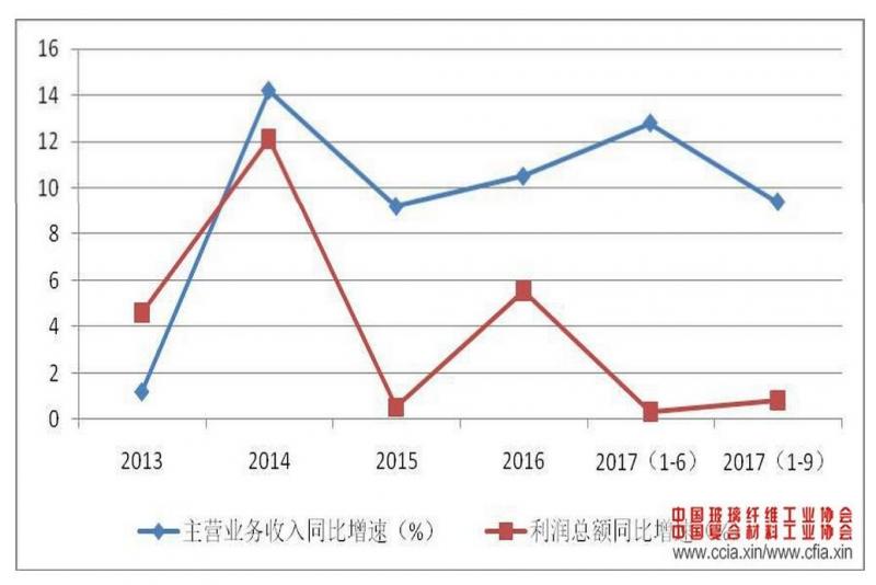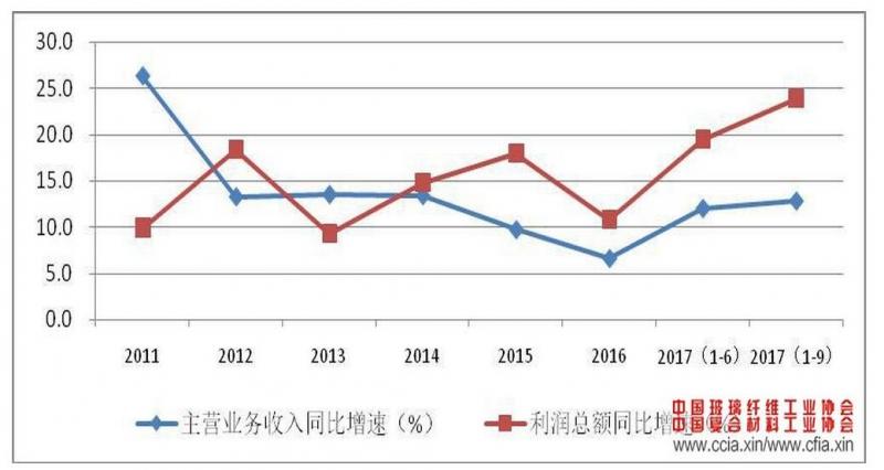 面對當前新形勢新挑戰,纖維復合材料行業一方面在政府產業政策引導、協會宣傳及大企業帶頭領導下,全行業積極形成行業共識,努力控制行業產能增長,另一方面企業積極應對環保趨嚴及成本上漲壓力,通過提升企業規范管理水平和實施轉型調整,努力實現企業專業化差異化發展,不斷尋求企業新的發展機遇和空間。1-9 月份,規模以上玻璃纖維及復合材料企業實現主營業務收入 2129.2 億元,同比增長 11.5%;利潤總額 152.1 億元,同比增長 15%。利潤增速明顯快于主營業務收入增速。