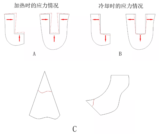 熱處理的工藝過程都要經(jīng)過加溫和冷卻來實現(xiàn)。工件的尺寸和形狀不同,必然影響受熱加溫和冷卻散熱的狀況。在工件的槽口處易于造成應(yīng)力集中現(xiàn)象,槽口處的應(yīng)力值往往幾倍于其他截面處的平均應(yīng)力值。槽口處的圓角半徑愈小,則顯現(xiàn)應(yīng)力集中的現(xiàn)象愈嚴重 (如A、B圖)。在尖銳棱角處也是最易于形成應(yīng)力集中的地方(如C圖)。