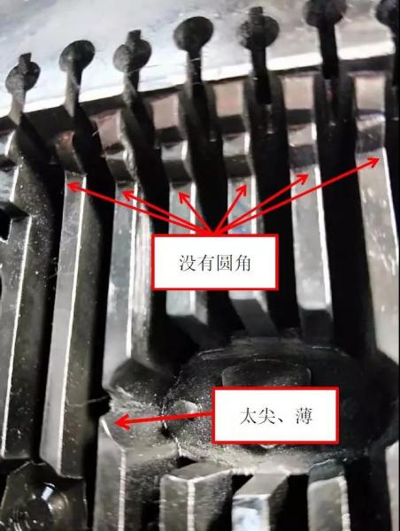 由于應(yīng)力集中,壓鑄200模次就出現(xiàn)裂紋。