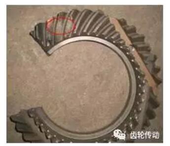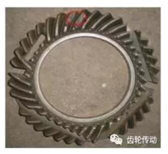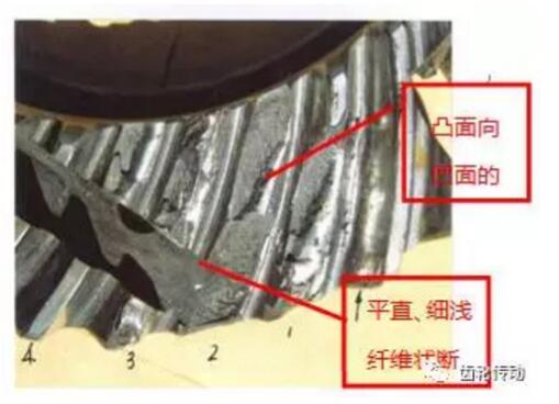 (1)位置:位于齒輪齒根圓角處。(2)形狀:裂紋面在齒的大端曲面與齒根圓面向下成約18-20度的角度,斷裂位置正是輪齒受力最大的位置。