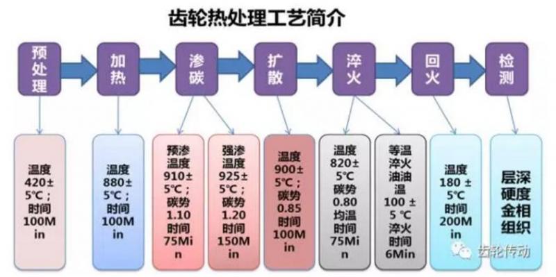 齒輪在熱處理時易產生的缺陷滲碳層、表面硬度、心部硬度及金相組織不均勻或者達不到工藝技術要求,如果工藝調整或執行不當,此時還有可能能產生淬火裂紋。